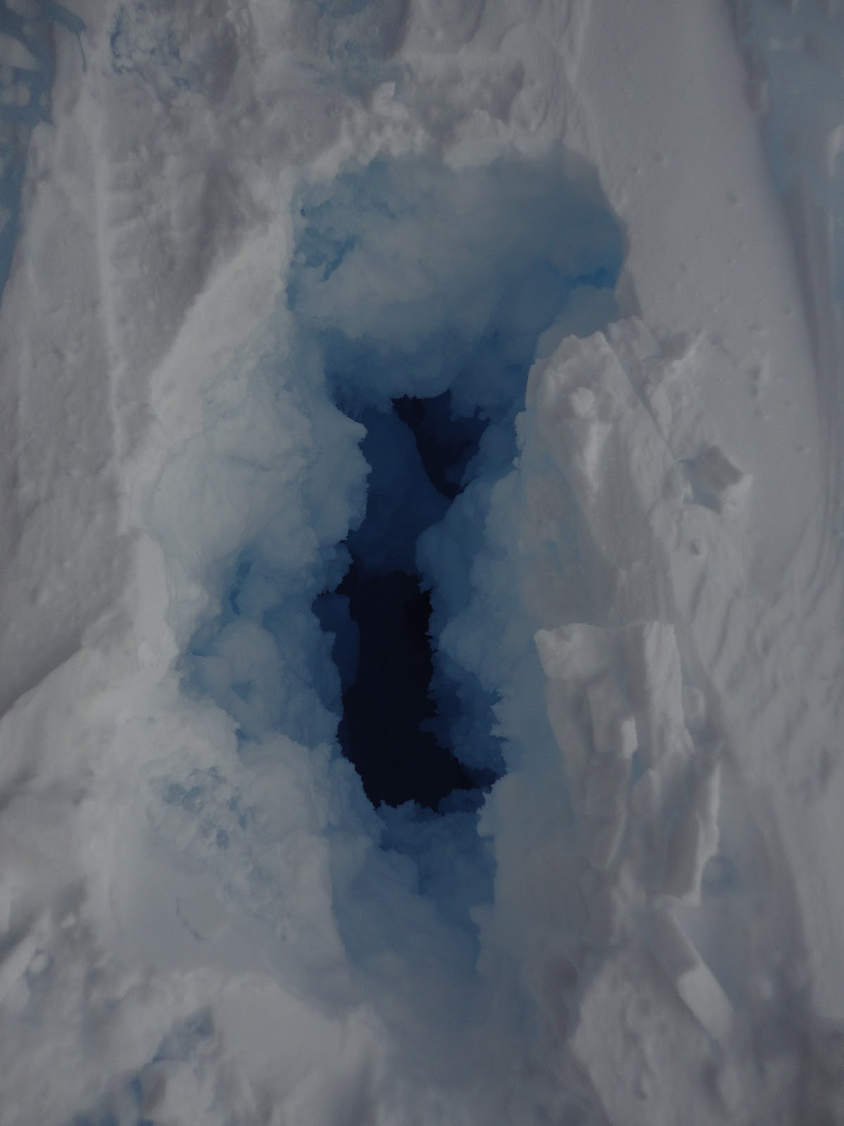 This crevasse was found a few feet from our helicopter and was at least 30-40' deep, and wide enough to swallow you.